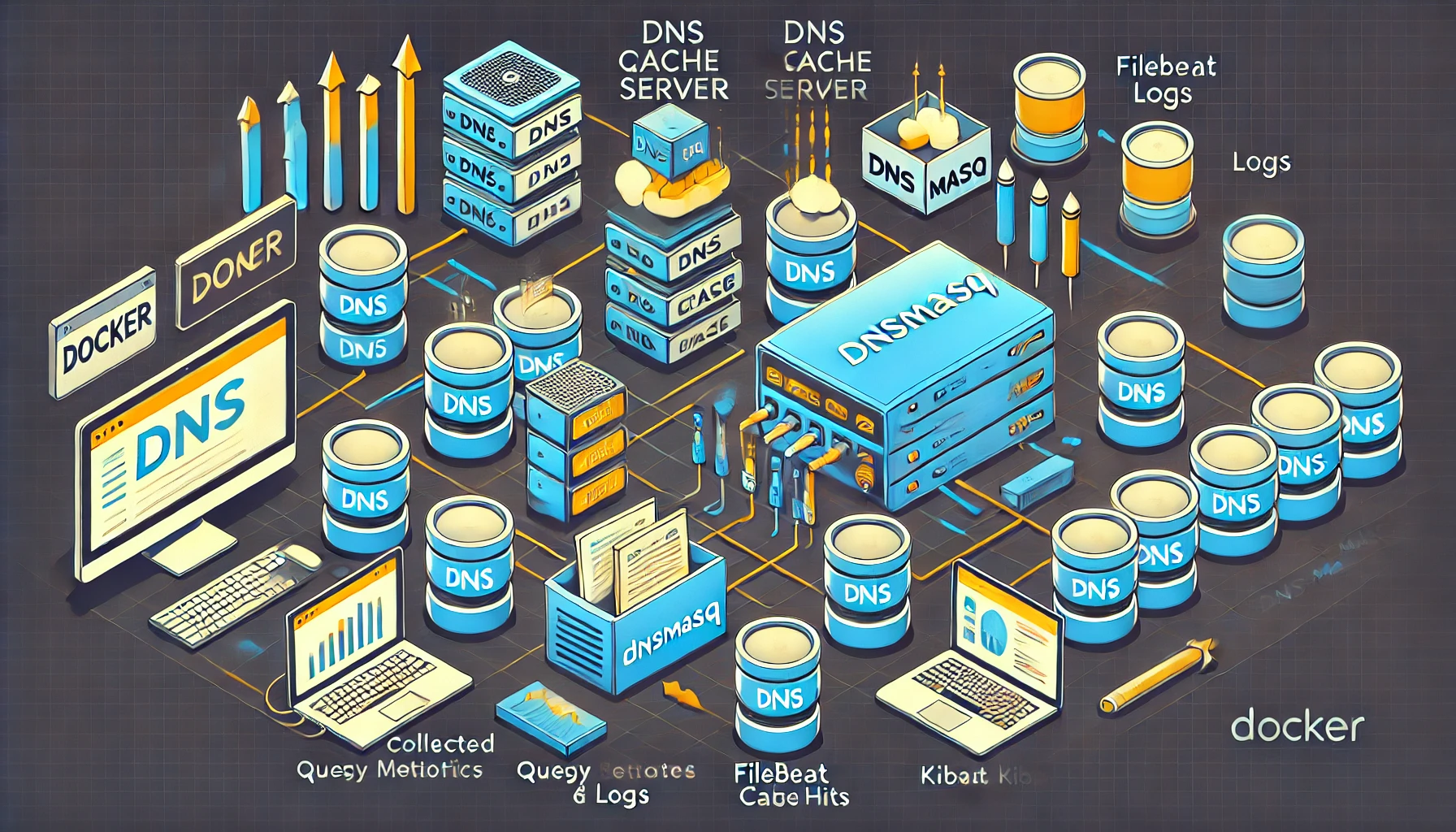 DNS 요청 및 응답 로그를 체계적으로 수집하고 모니터링하기 위해 Fluentd나 Filebeat를 활용할 수 있습니다. 예를 들어, Filebeat를 사용하여 dnsmasq 로그를 Elasticsearch로 전송한 뒤 Kibana에서 시각화할 수 있습니다.