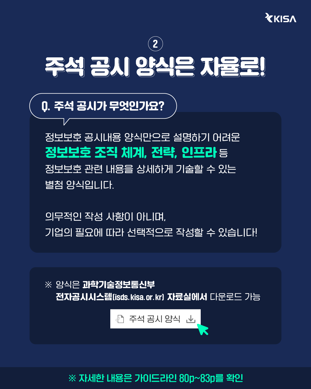 - 개정된 정보보호 공시 가이드라인 및 FAQ 사례집을 확인하여 공시 준비