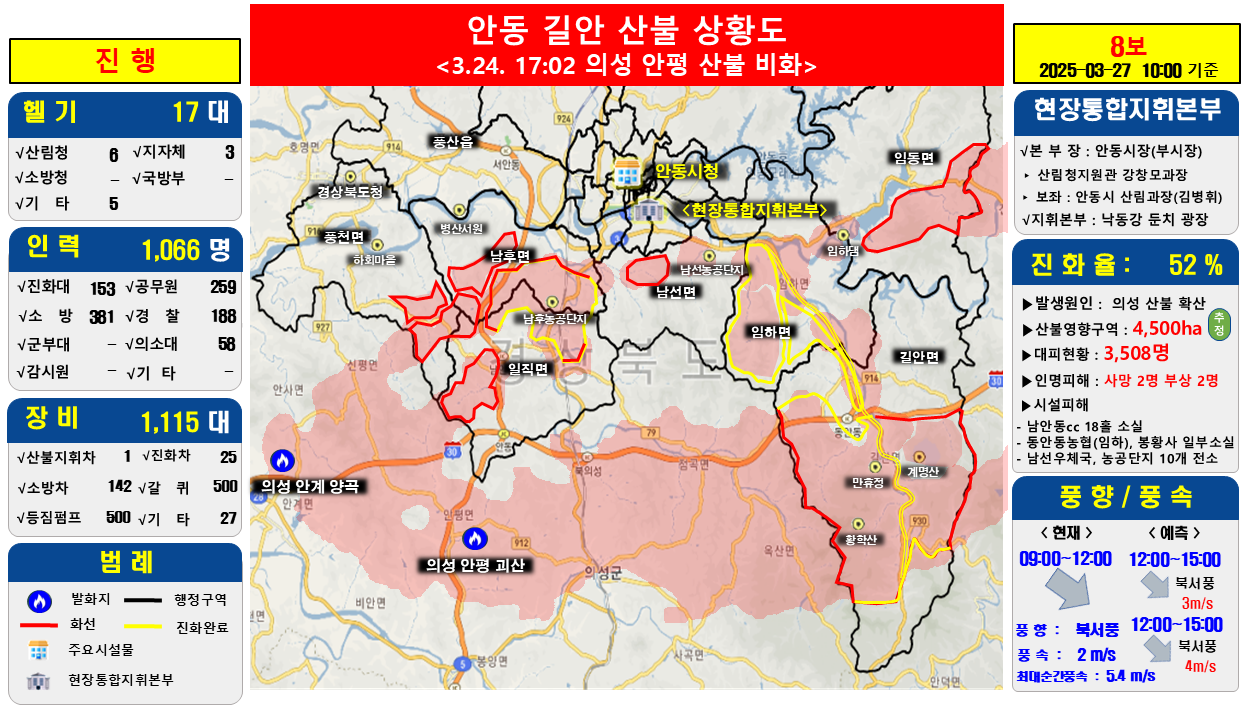 - 의성군 및 안동시: 산불로 인해 약 2만 9,911명의 주민이 대피하였으며, 이 중 1만 6,700여 명이 아직 귀가하지 못하고 있습니다.