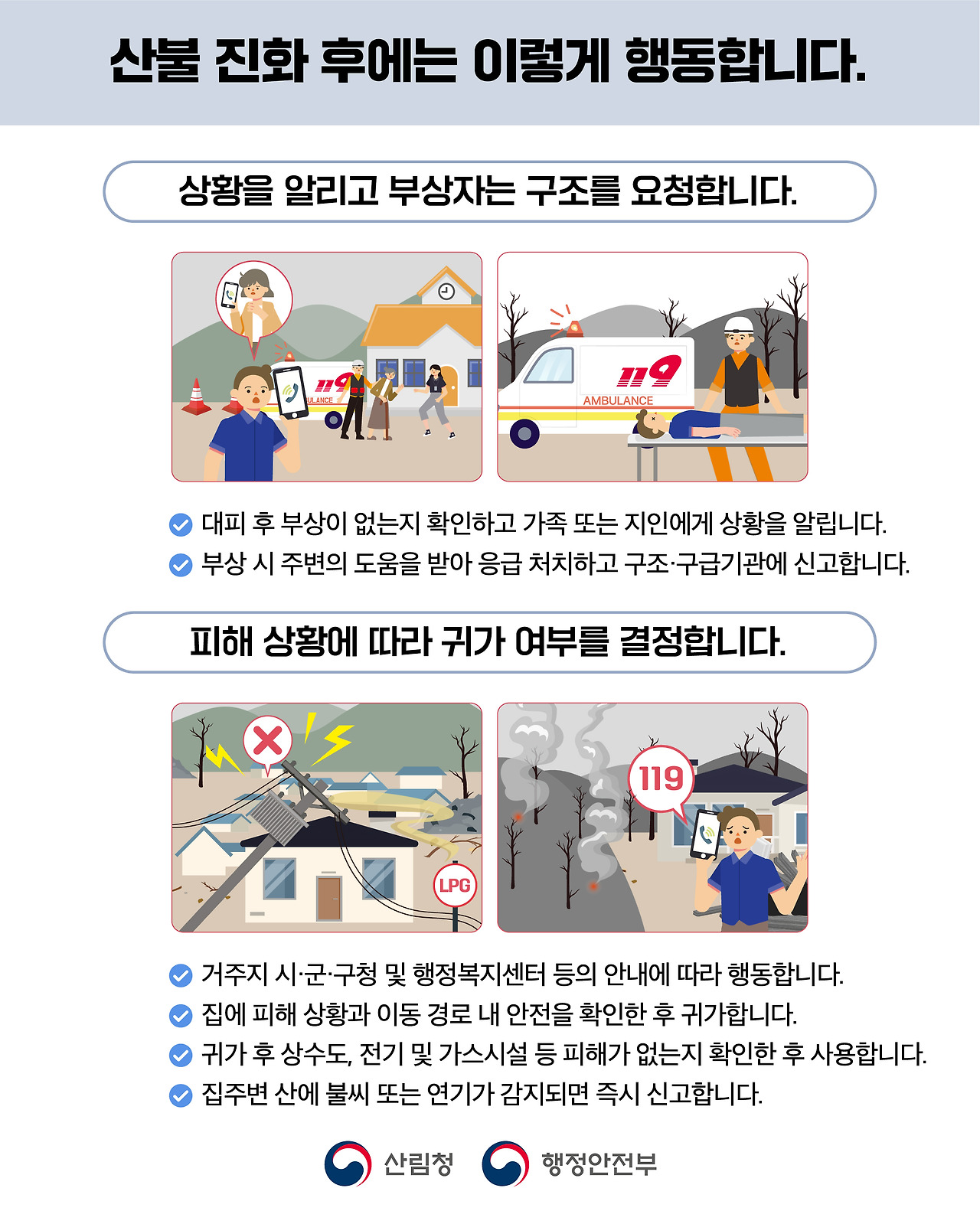 - 휴대전화, 라디오, 안내방송을 통해 산불 정보를 확인하고 주변 사람들에게 상황을 알립니다.