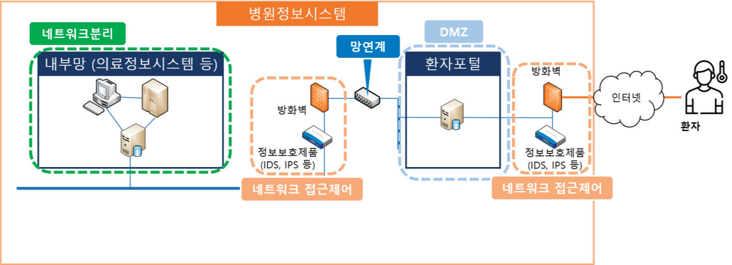 - 인터넷 연계: 외부 환자 접근 포털, 보험청구 등은 DMZ 구간에 위치시키고 IDS/IPS, 방화벽 적용.
