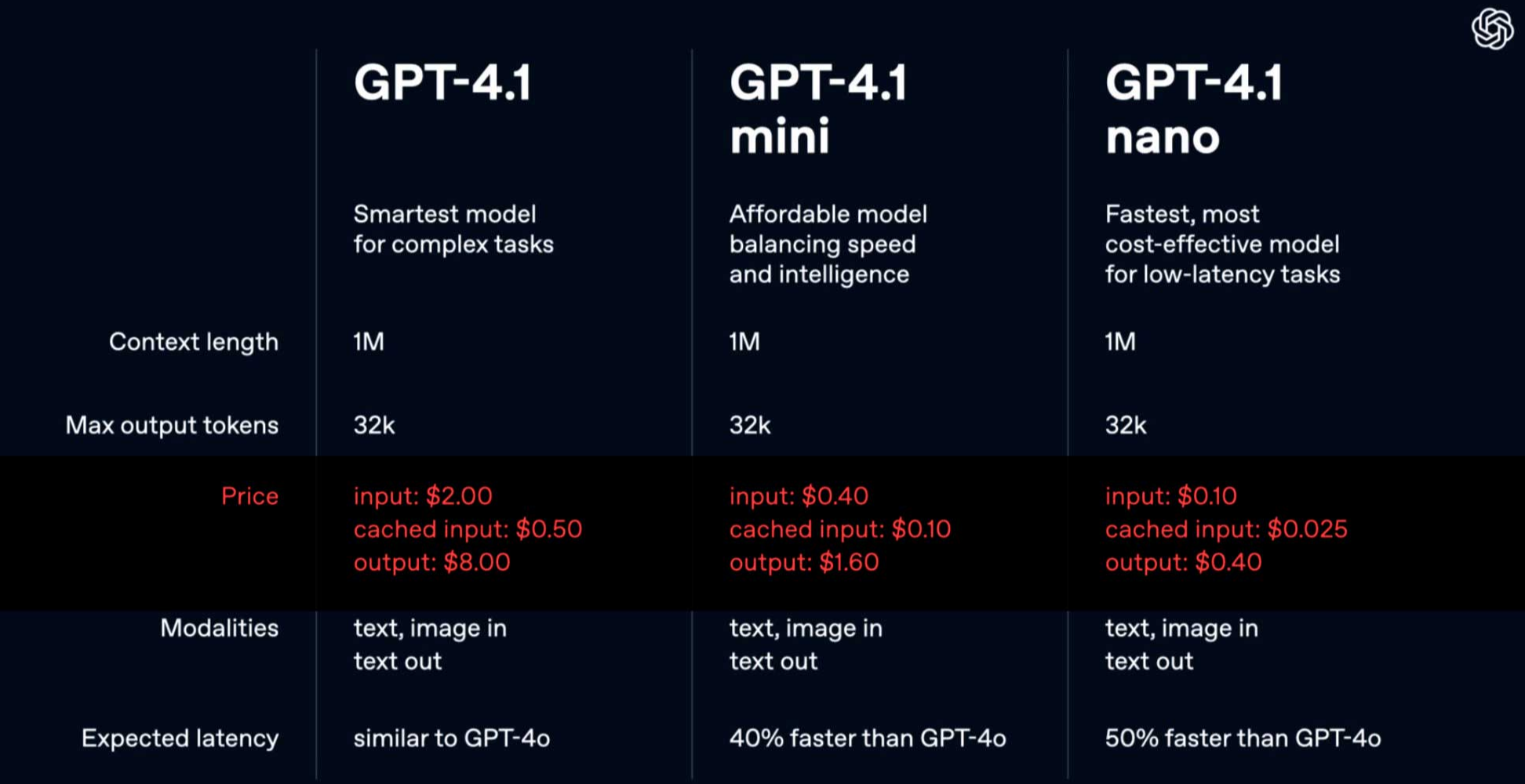 OpenAI가 2025년 4월에 공개한 GPT-4.1 시리즈는 기존 GPT-4o 대비 지능, 속도, 비용, 멀티모달 이해 능력 측면에서 모두 향상된 모델군입니다.