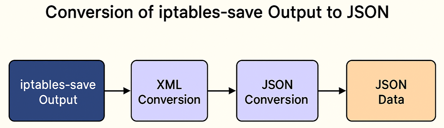 iptables-save를 XML로 변환한 뒤, JSON으로 변환하는 과정과 사용 예시입니다.
