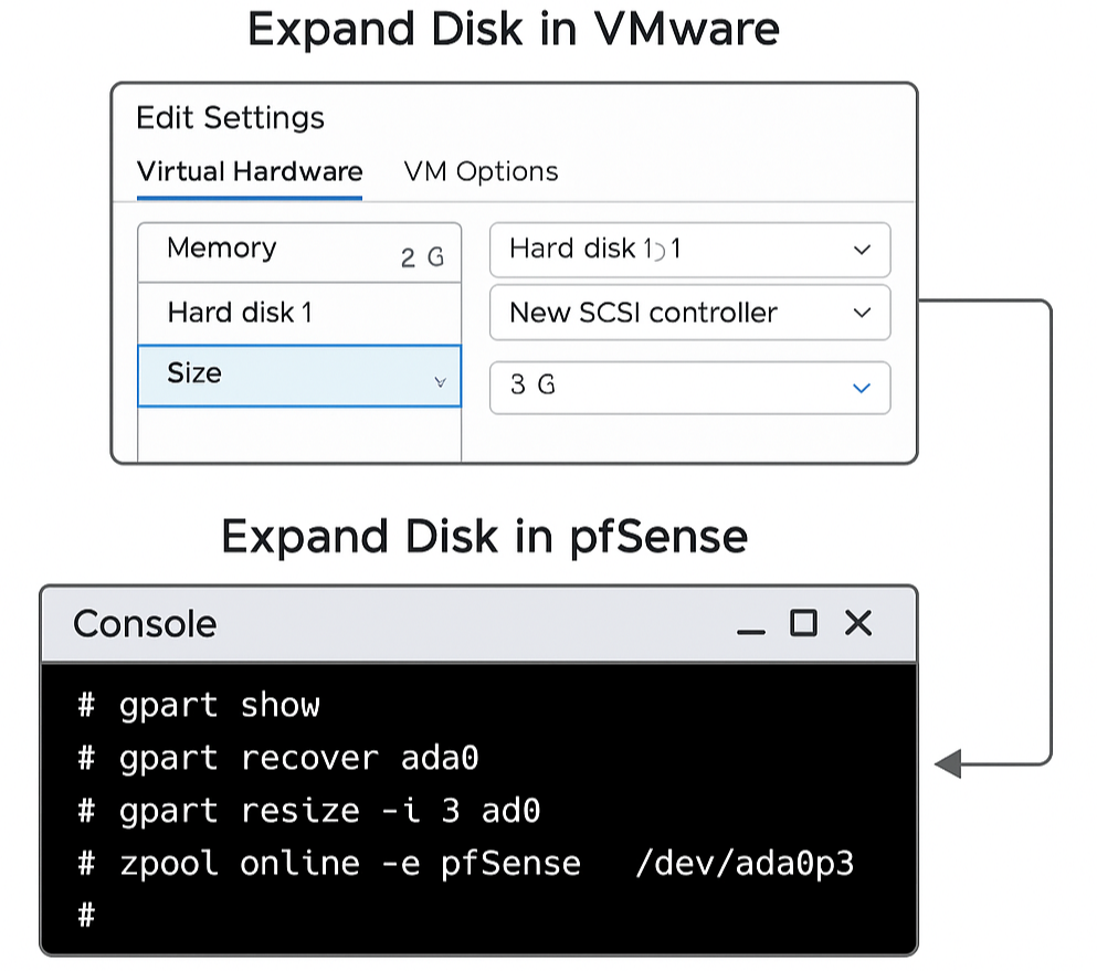 VMware에서 디스크 크기를 증가시켰다면, pfSense 내부에서 이를 인식할 수 있도록 확인이 필요합니다.