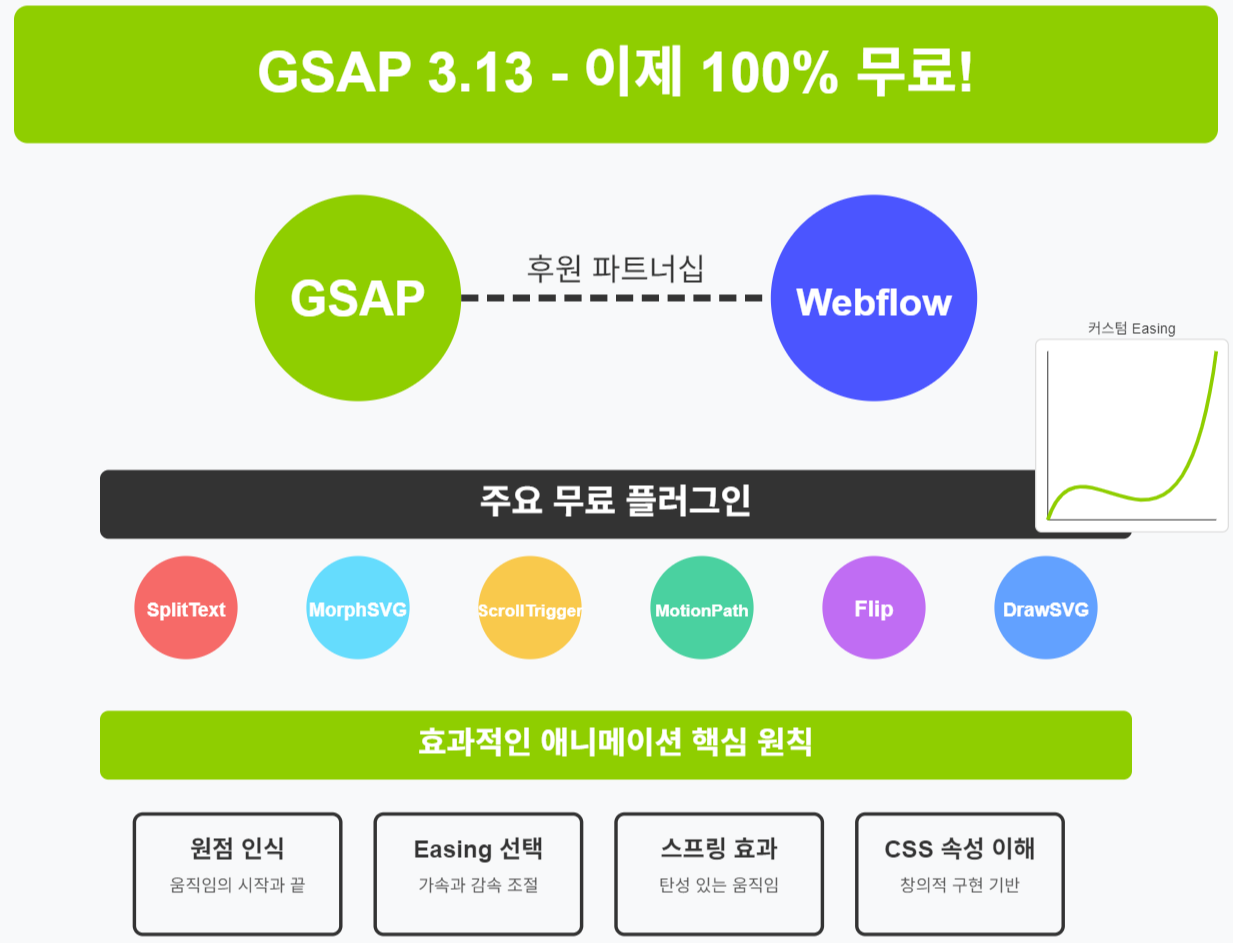 - 100% 무료화: Webflow의 후원으로 모든 GSAP 기능과 플러그인 완전 무료로 전환