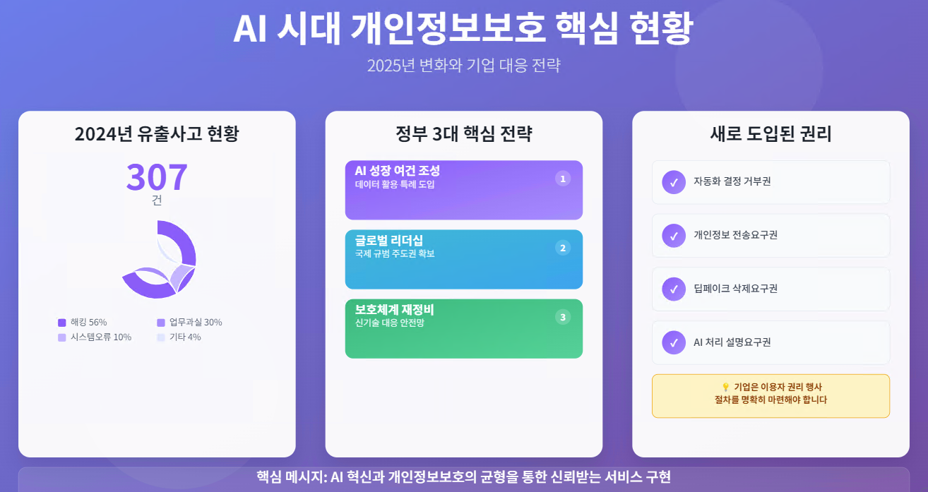 AI 기술의 급속한 발전과 함께 개인정보보호 환경이 근본적으로 변화하고 있습니다. 2025년 현재, 개인정보보호법의 대폭 개정과 AI 시대에 맞는 새로운 규제 체계 도입으로 기업들은 전면적인 개인정보 관리 체계 재정비가 필요한 시점에 있습니다.
