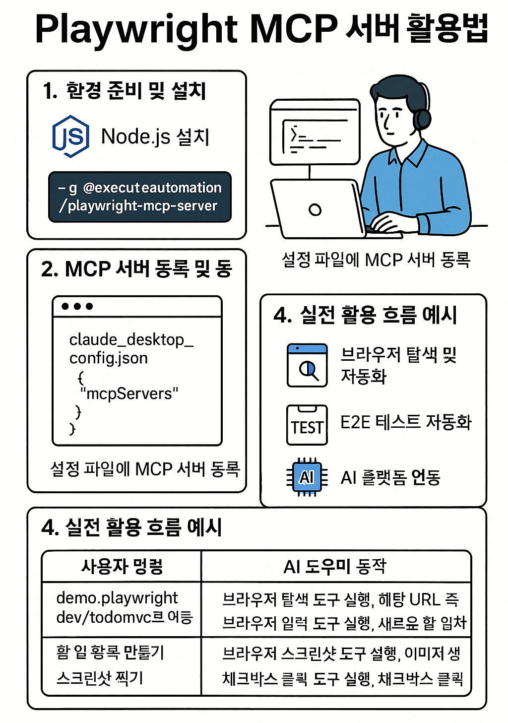 | 설치 | Node.js + @executeautomation/playwright-mcp-server |