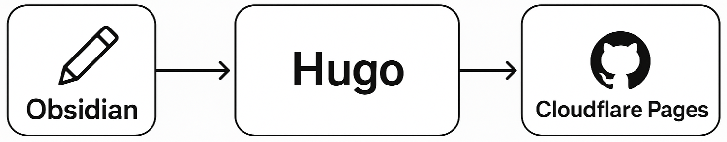 Obsidian (글 작성) → Hugo (사이트 생성) → GitHub (버전 관리) → Cloudflare Pages (배포)