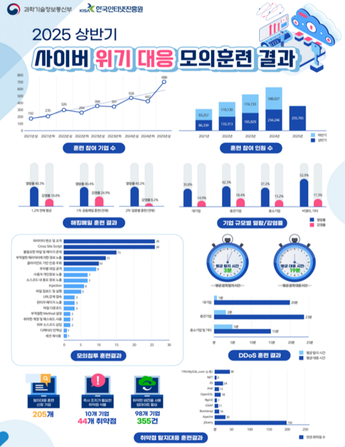 과학기술정보통신부와 한국인터넷진흥원이 공동 주관한 2025년 상반기 사이버 위기 대응 모의훈련이 5월 중순부터 2주간 진행되었습니다. 총 688개 기업, 25만 명 이상이 참여하여 역대 최대 규모를 기록했고, 다양한 형태의 사이버 공격 시나리오에 대응하며 기업들의 실질적인 대응 역량을 강화했습니다.