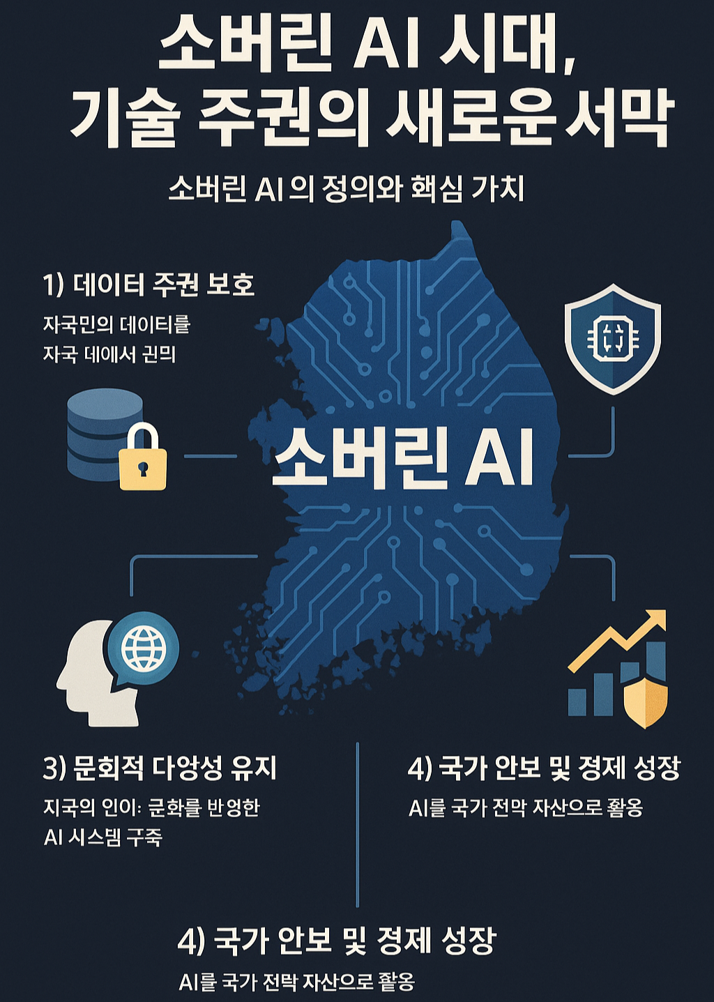 이는 단순한 기술 개념을 넘어 정치, 경제, 사회적 함의를 포함하는 광범위한 아이디어입니다. AI가 사회의 모든 분야에서 혁신을 촉진하고 국가 안보 및 경제 주권의 핵심 자산이 되면서, 각국은 AI 인프라를 외부에 의존할 경우 새로운 기술 패권 질서에서 주체가 되기 어렵다는 인식을 갖게 되었습니다.