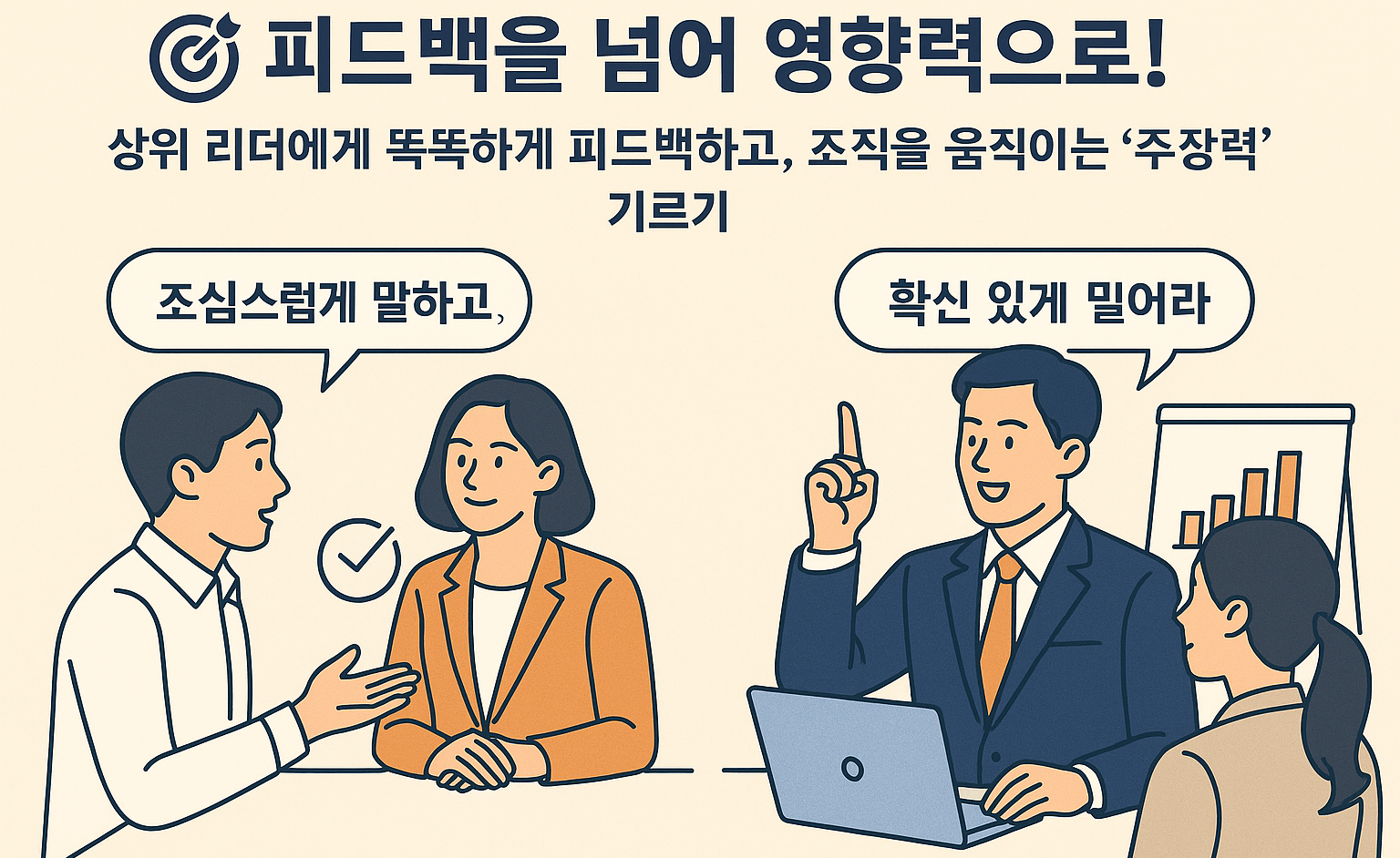 직장생활에서 누구나 한 번쯤은 이런 생각을 해보셨을 겁니다. "상사가 이렇게 하면 더 좋을 텐데...", "이 방법이 더 효율적인데 왜 안 바꾸지?" 하지만 대부분은 속으로만 생각하고 끝냅니다. 상사에게 피드백하는 것은 위험하고, 조직에서 목소리를 내는 것은 부담스럽기 때문이죠. 리더에게 효과적으로 피드백하는 방법부터 시작해, 조직에서 진정한 영향력을 발휘하는 '주장하는 리더십' 단계입니다.