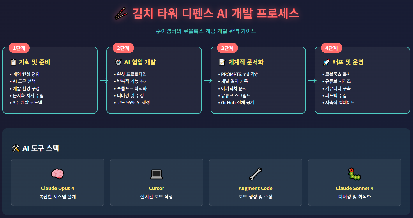 이렇게 체계적인 접근과 꼼꼼한 문서화를 통해, AI 도구를 활용한 로블록스 게임 개발은 누구나 도전할 수 있는 현실적인 목표가 됩니다. 중요한 것은 "vibe coding"이 아닌 "정밀한 협업"이며, 모든 과정을 투명하게 기록하여 커뮤니티와 함께 성장하는 것입니다.