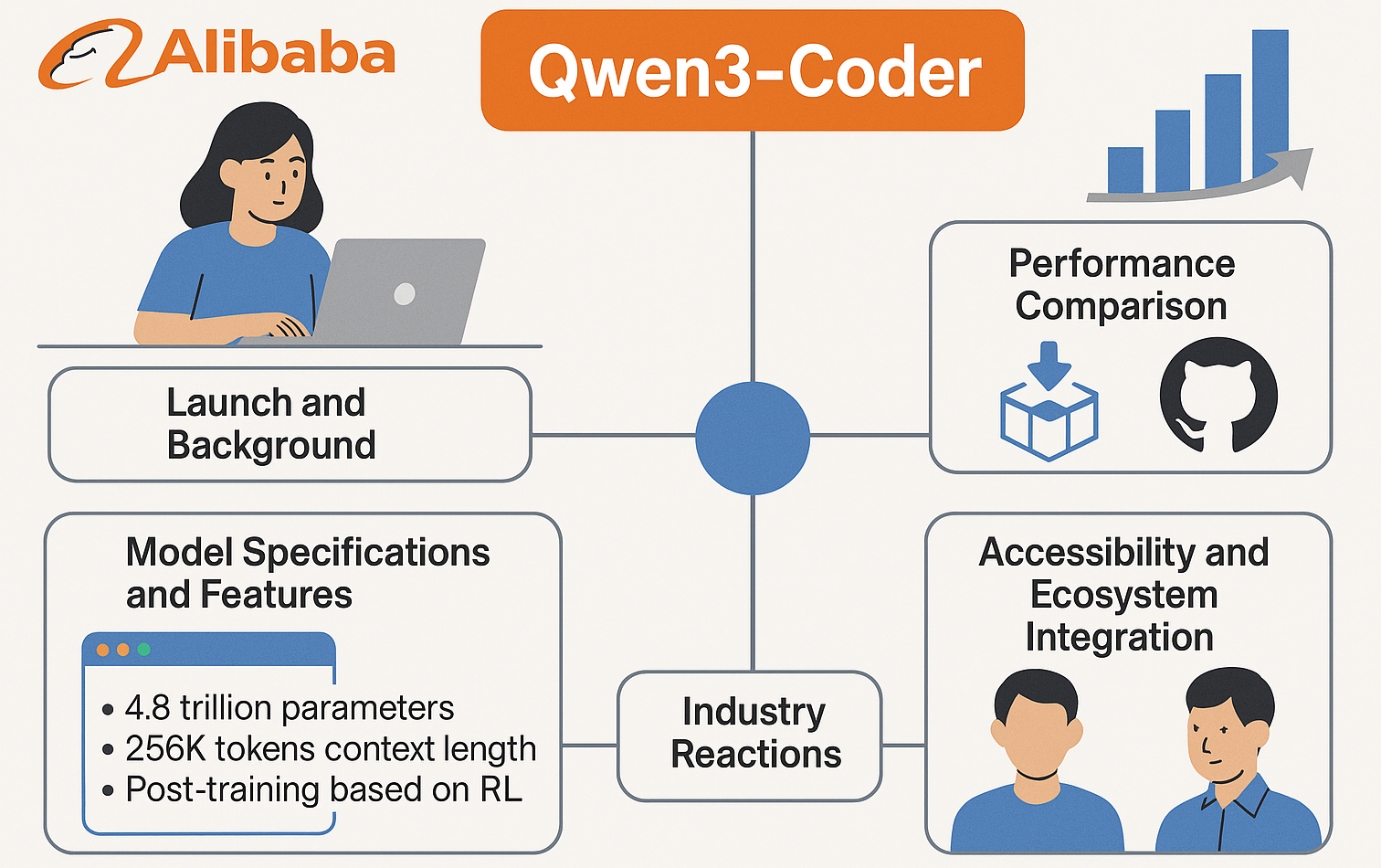 알리바바는 급성장하는 AI 코딩 어시스턴트 시장에서 오픈소스 생태계를 주도하기 위해 Qwen3-Coder를 개발했습니다. 개발자 부족과 효율성 요구로 인해 AI 프로그래밍 어시스턴트 시장이 빠르게 확장되고 있으며, Microsoft, OpenAI, Google, Amazon 등 주요 기업들이 코딩 작업 자동화를 위해 경쟁하고 있는 상황에서 출시되었습니다.