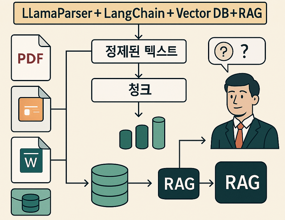 문서 업로드 → LlamaParser 파싱 → LangChain 분할 → 임베딩 → 벡터 DB 저장 → 질문 임베딩 → 벡터 검색 → RAG 응답 생성