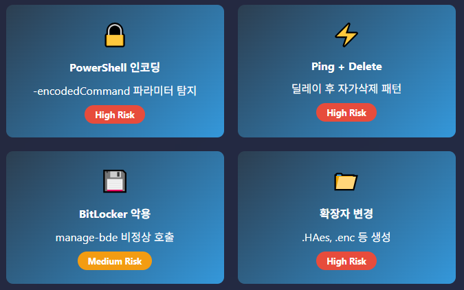| 정상 도구 악용 | PowerShell, wscript, BitLocker 등 운영체제 내장 도구 사용 | 🔴 High |