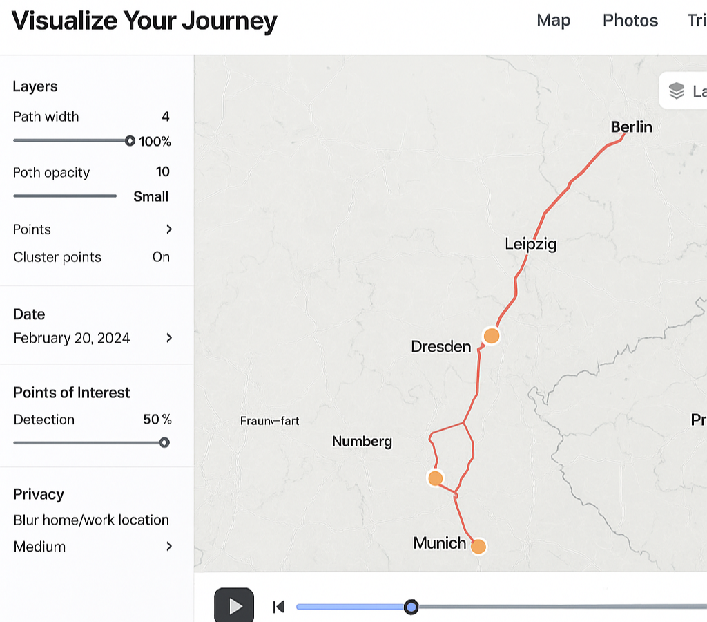 - 기존 기록 재활용: Google 타임라인 JSON → 변환 → Trip Layer 애니메이션
