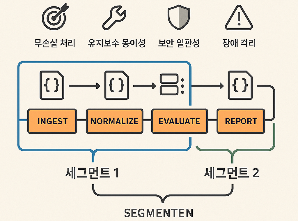 - 책임(SRP): 수집/정규화/평가/조치/보고는 단계별로 분리.