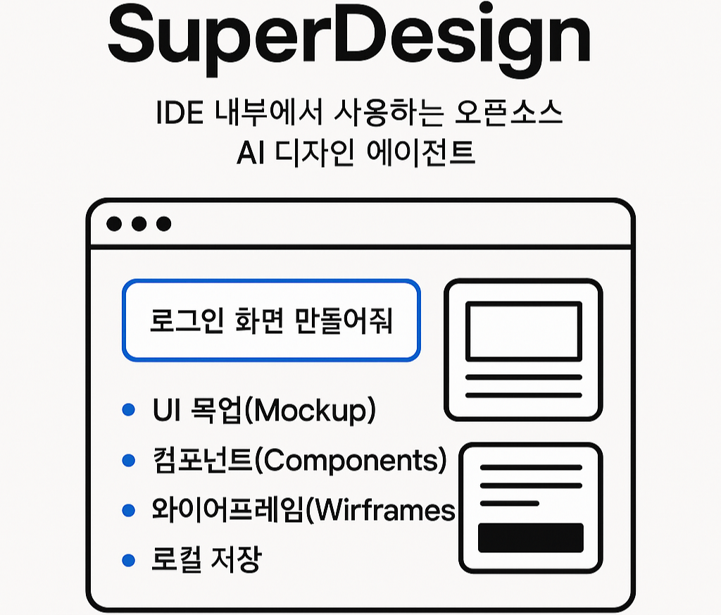 SuperDesign은 IDE 내부에서 직접 실행되는 오픈소스 AI 디자인 에이전트입니다. 자연어 프롬프트를 입력하면 곧바로 UI 목업(mockup), 컴포넌트, 와이어프레임을 자동 생성하며, 결과물은 IDE에 바로 코드로 삽입할 수 있습니다. 기존의 Figma, Sketch 같은 별도 툴을 거치지 않고 디자인 → 코드 → 실행까지 IDE 안에서 완결할 수 있다는 점이 핵심 혁신 포인트입니다.