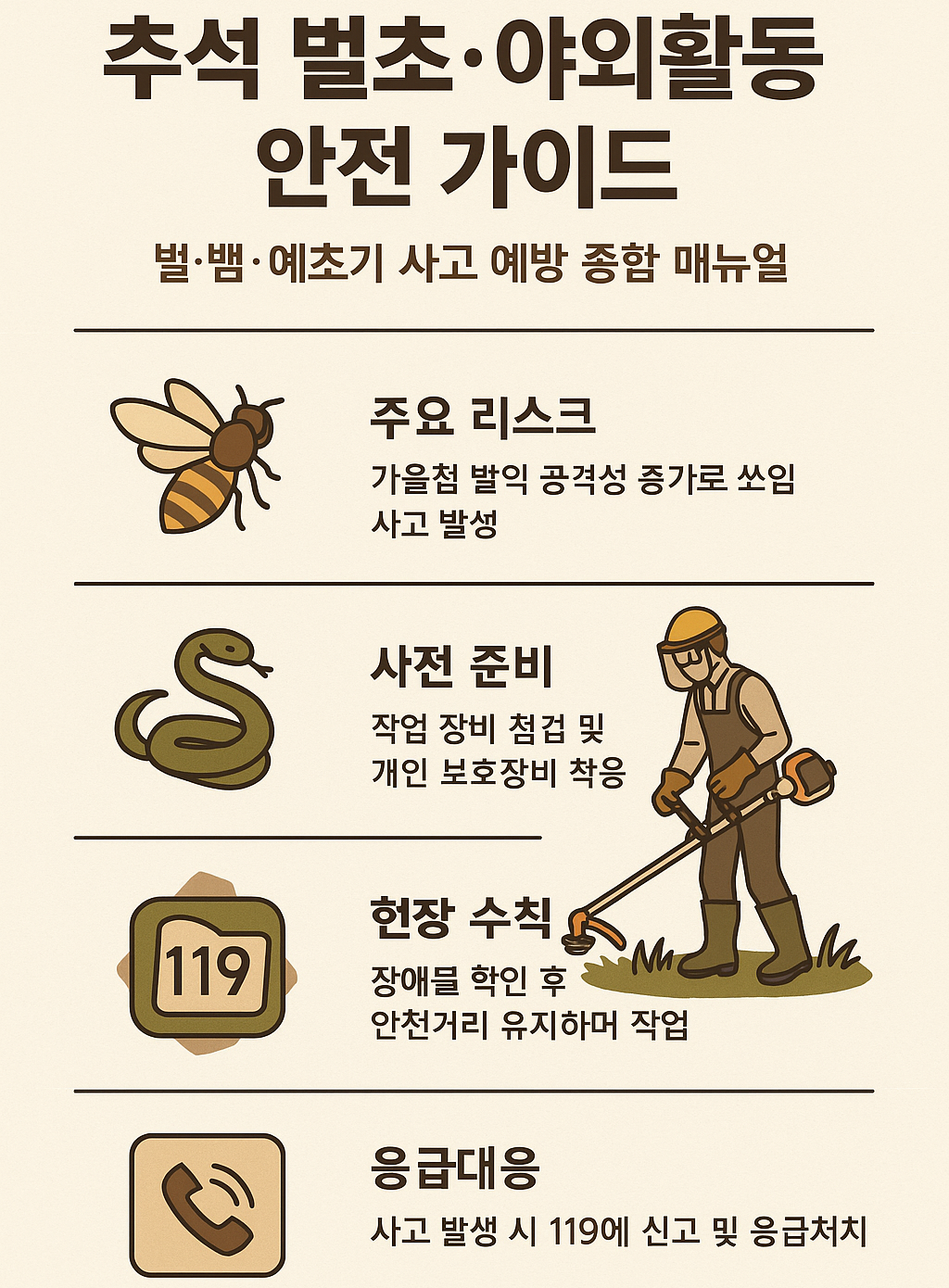 - 현장 예비조사: 긴 막대·갈퀴로 풀숲 두드려 벌집/뱀/장애물 탐지, 작업동선·탈출로·119 진입로 확인.