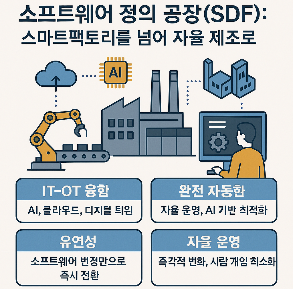 - SDF: IT-OT 융합 + AI + 디지털 트윈 + 마이크로서비스로 완전 자율·유연