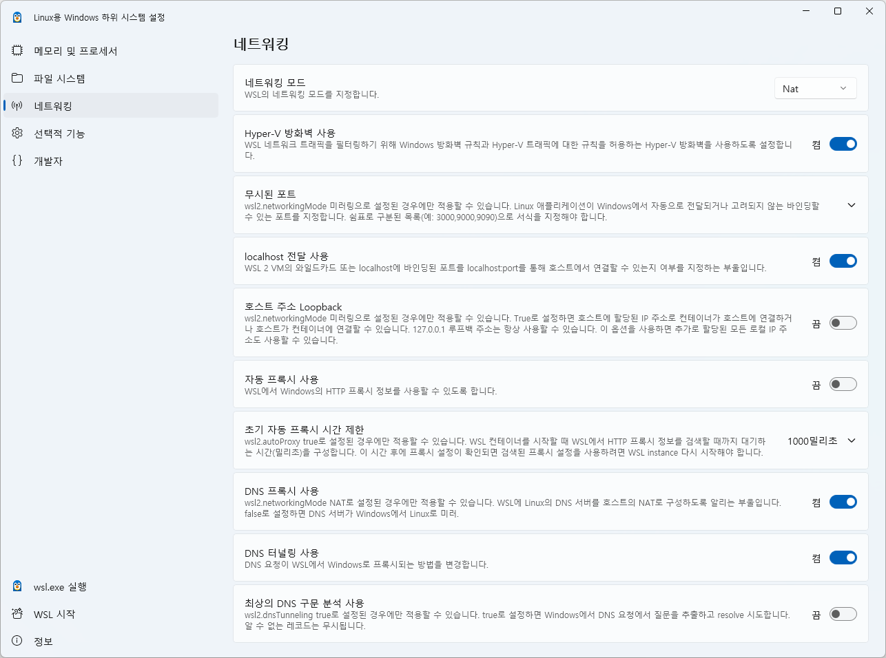 위치: %USERPROFILE%\.wslconfig (예: C:\Users\계정\.wslconfig)