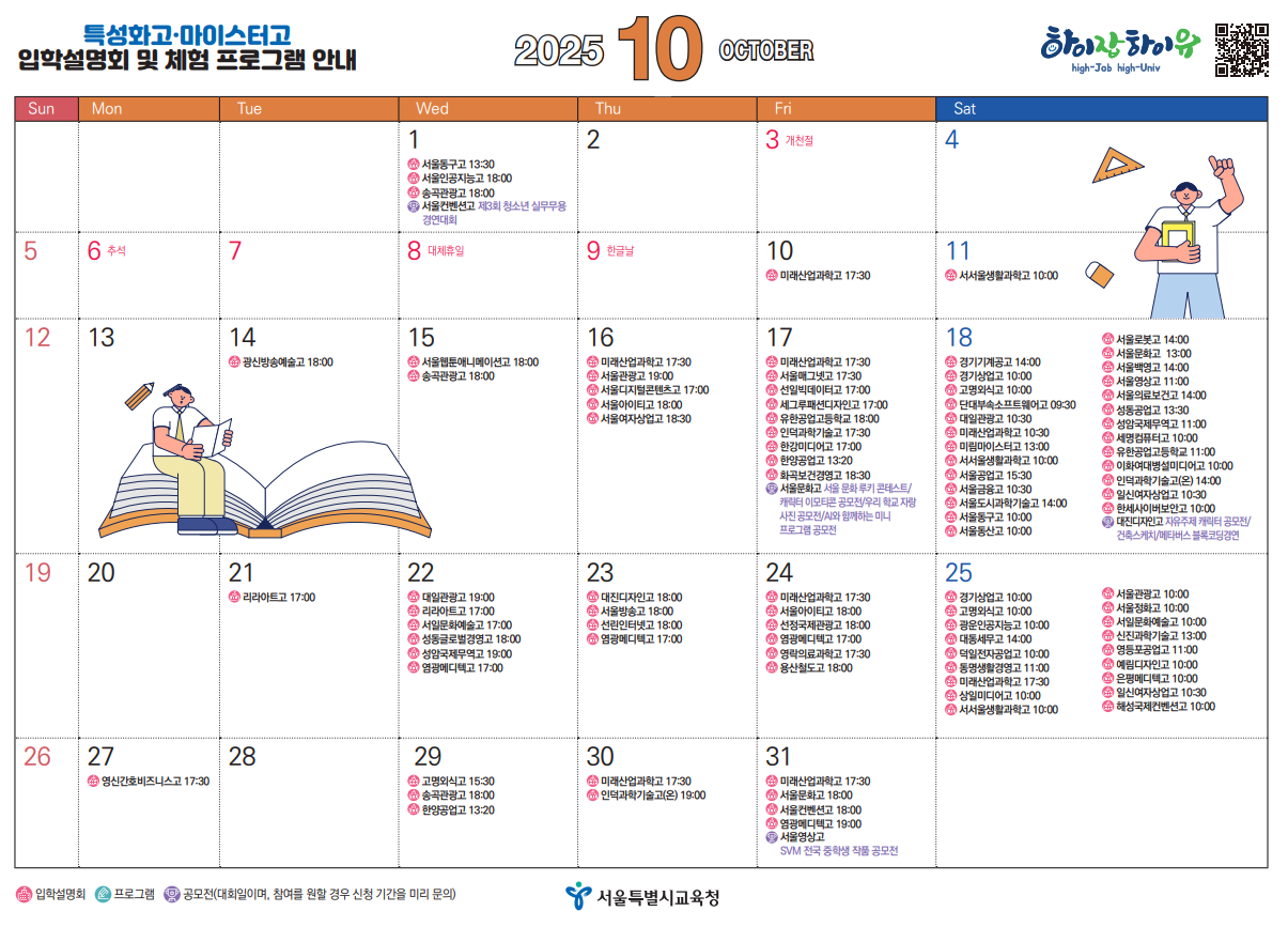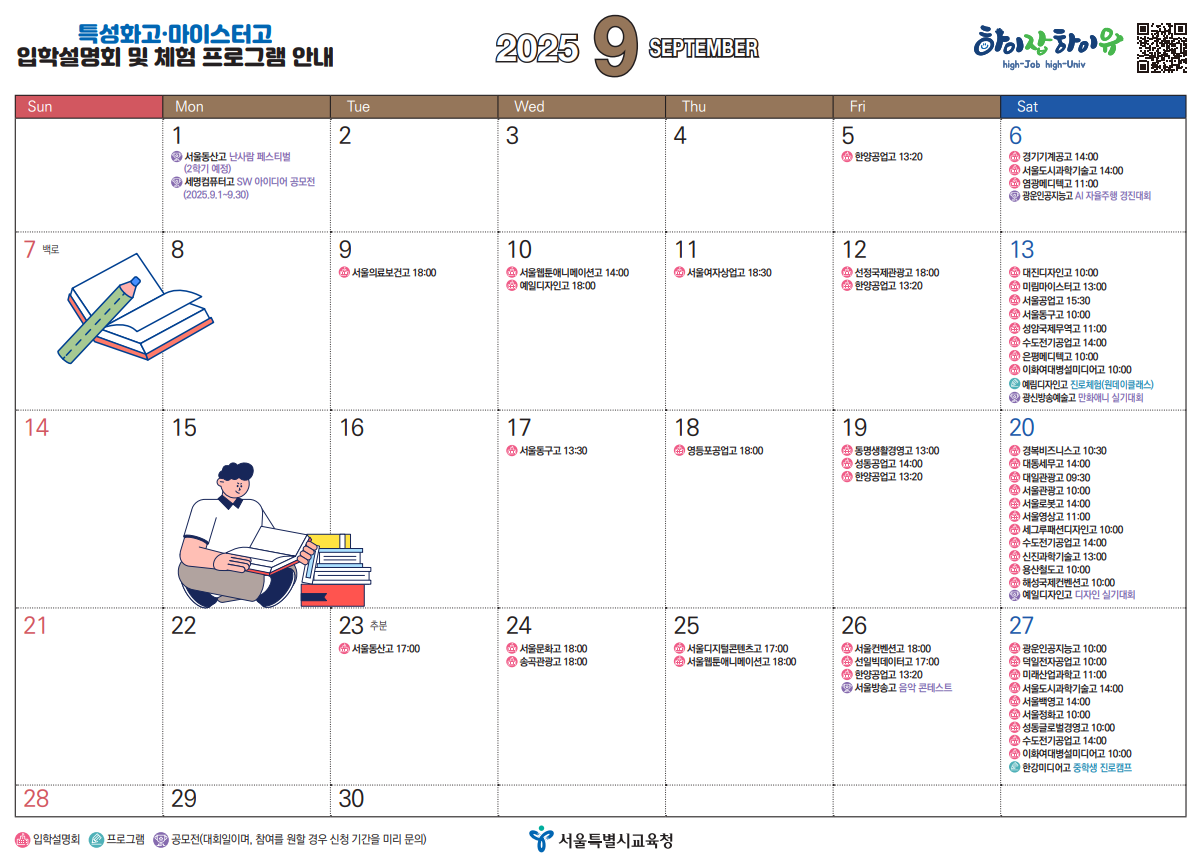 서울특별시교육청에서 2025학년도 특성화고·마이스터고 하반기 학교별 입학설명회와 체험 프로그램 일정을 공개했습니다.