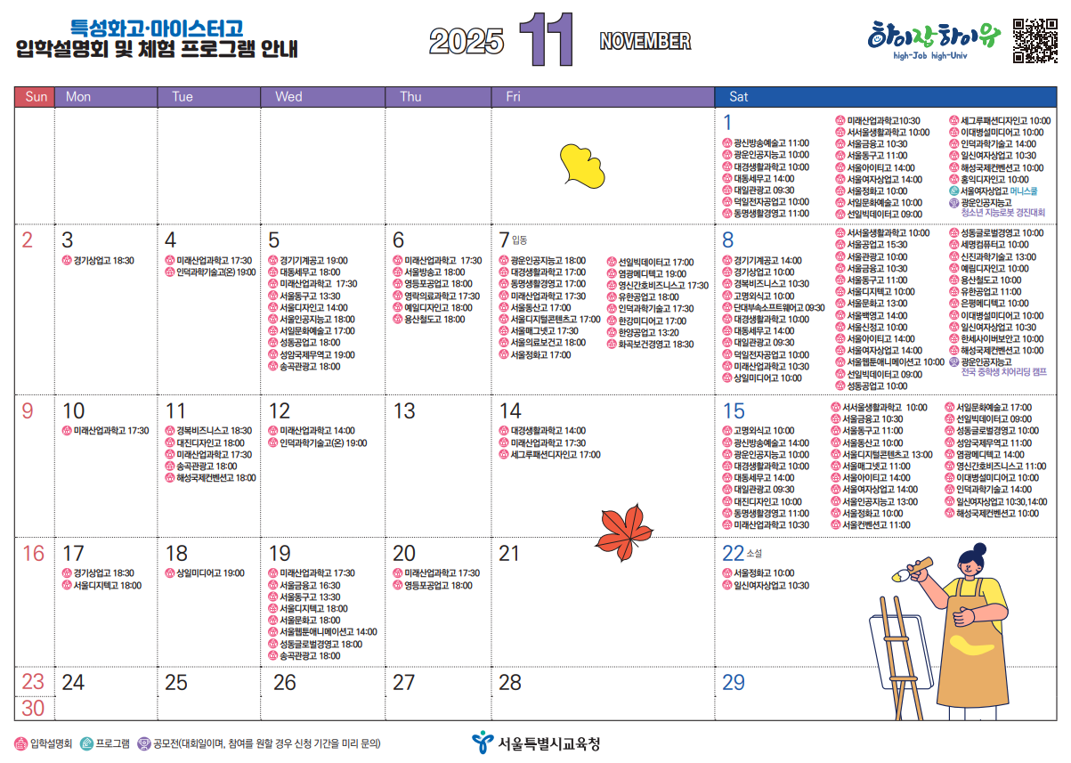 서울특별시교육청에서 2025학년도 특성화고·마이스터고 하반기 학교별 입학설명회와 체험 프로그램 일정을 공개했습니다.