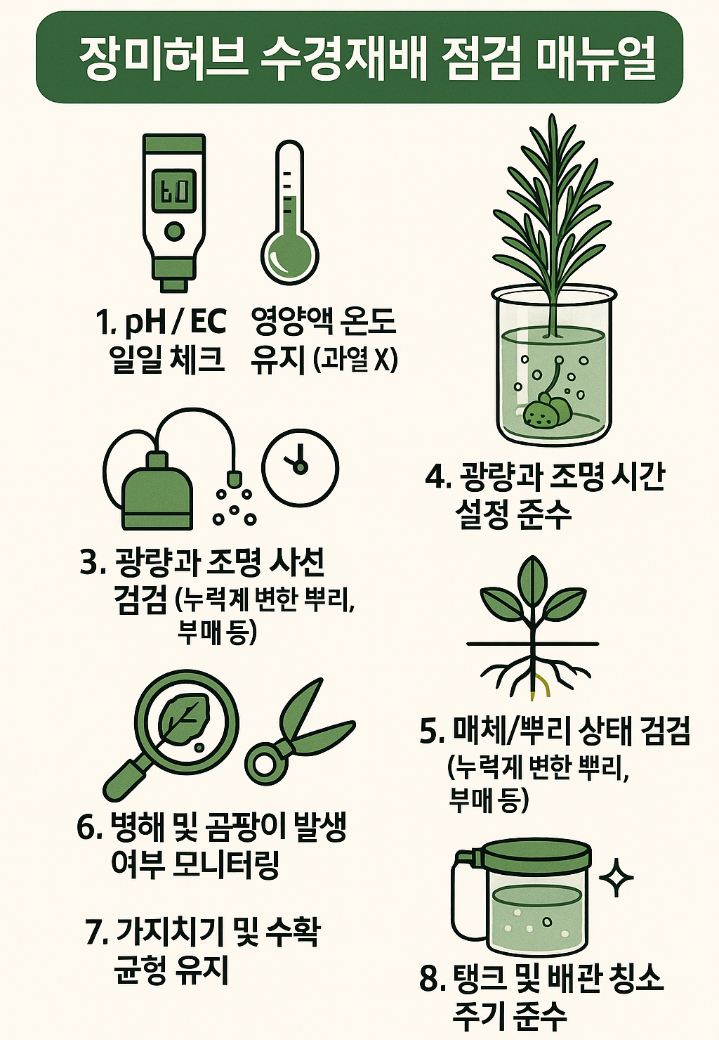 - 주간: 탱크 위치/차광 점검(직사광선 회피), 펌프 발열 여부 점검.
