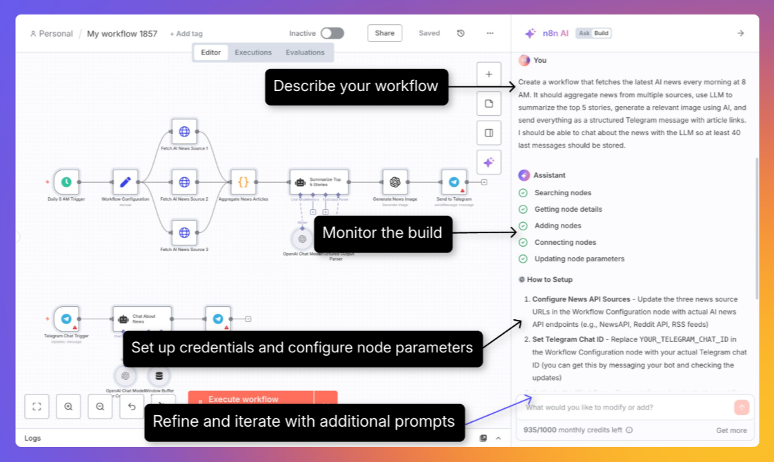 - 생성 워크플로우가 미완성/오류: 에디터에서 누락 파라미터(자격증명·필수 필드) 채우고, 간단한 프롬프트로 단계적으로 개선.