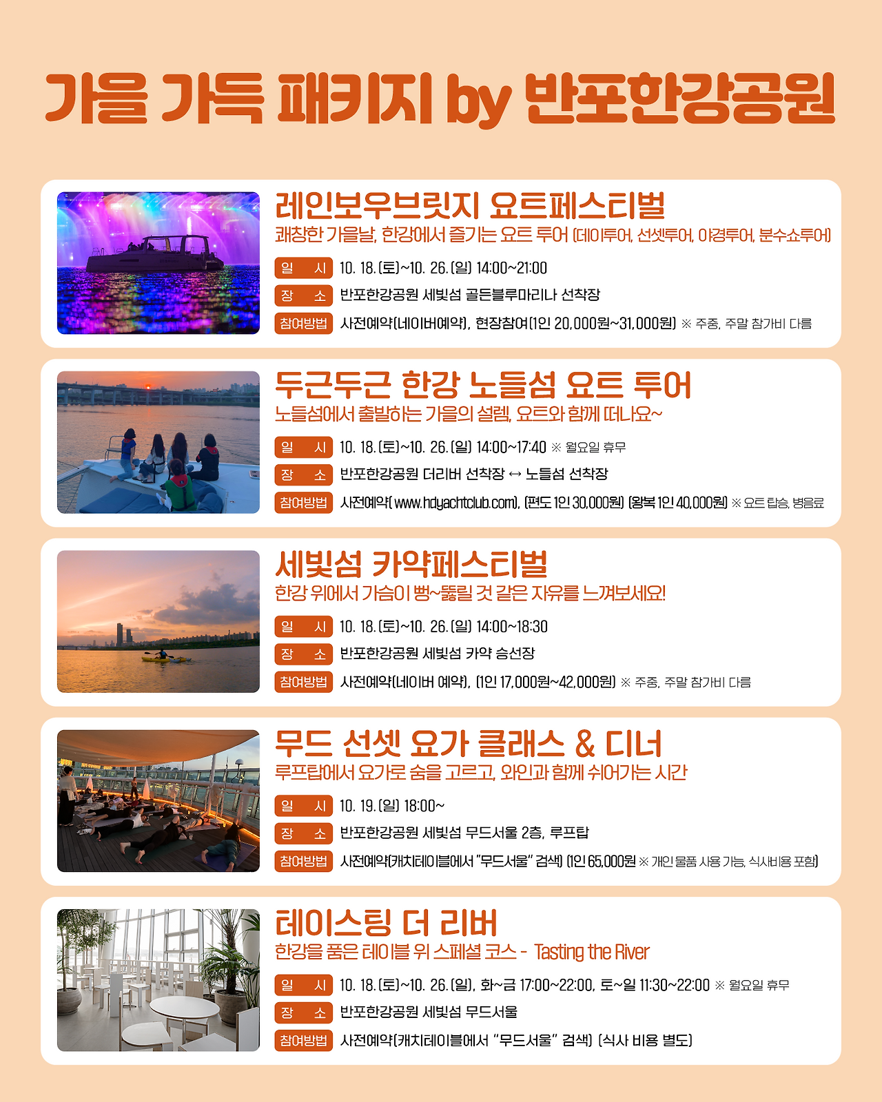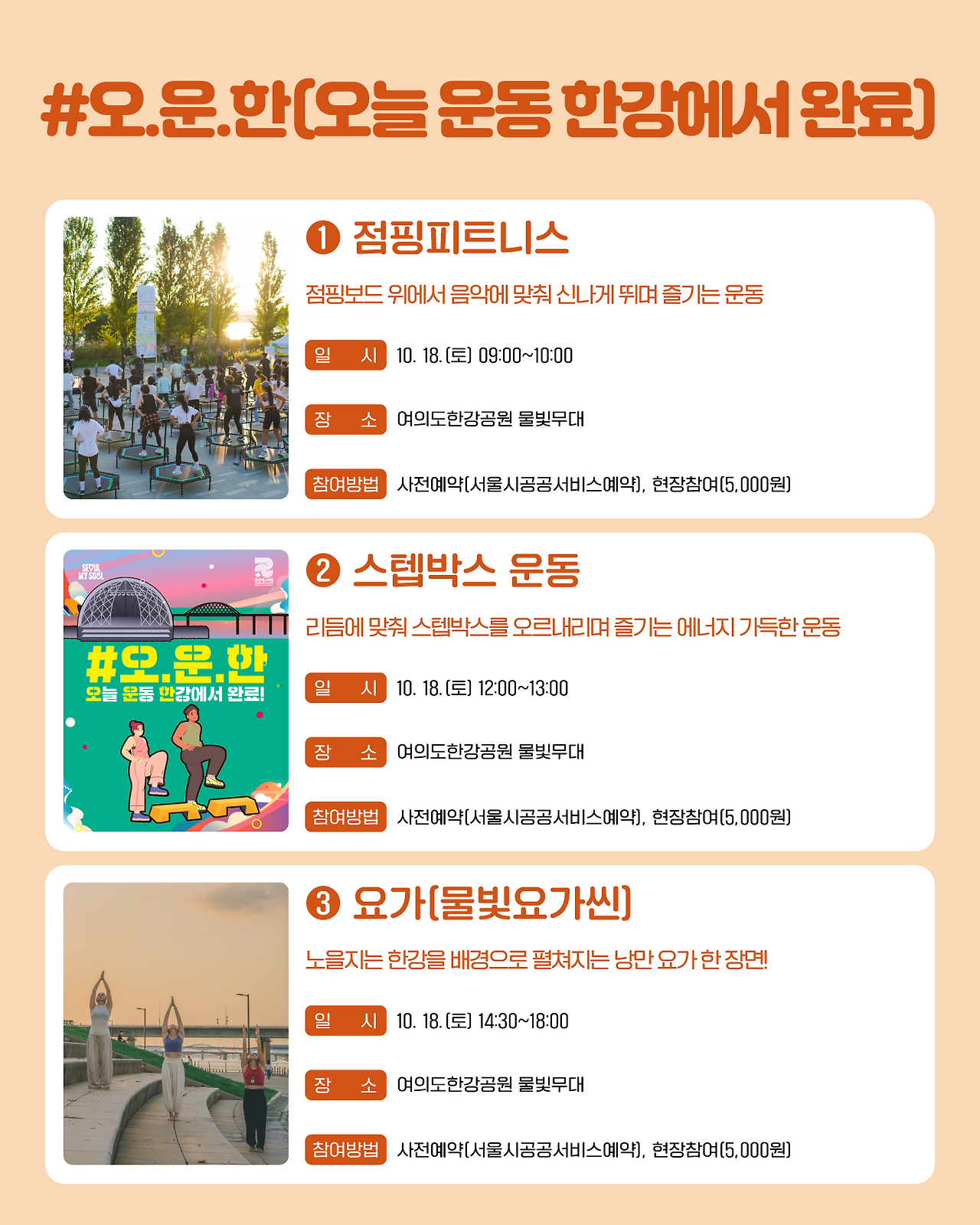 예: 점핑 피트니스, 스텝박스, 요가, 카약 페스티벌, 무소음 DJ 파티 등은 사전 예약이 요구됨