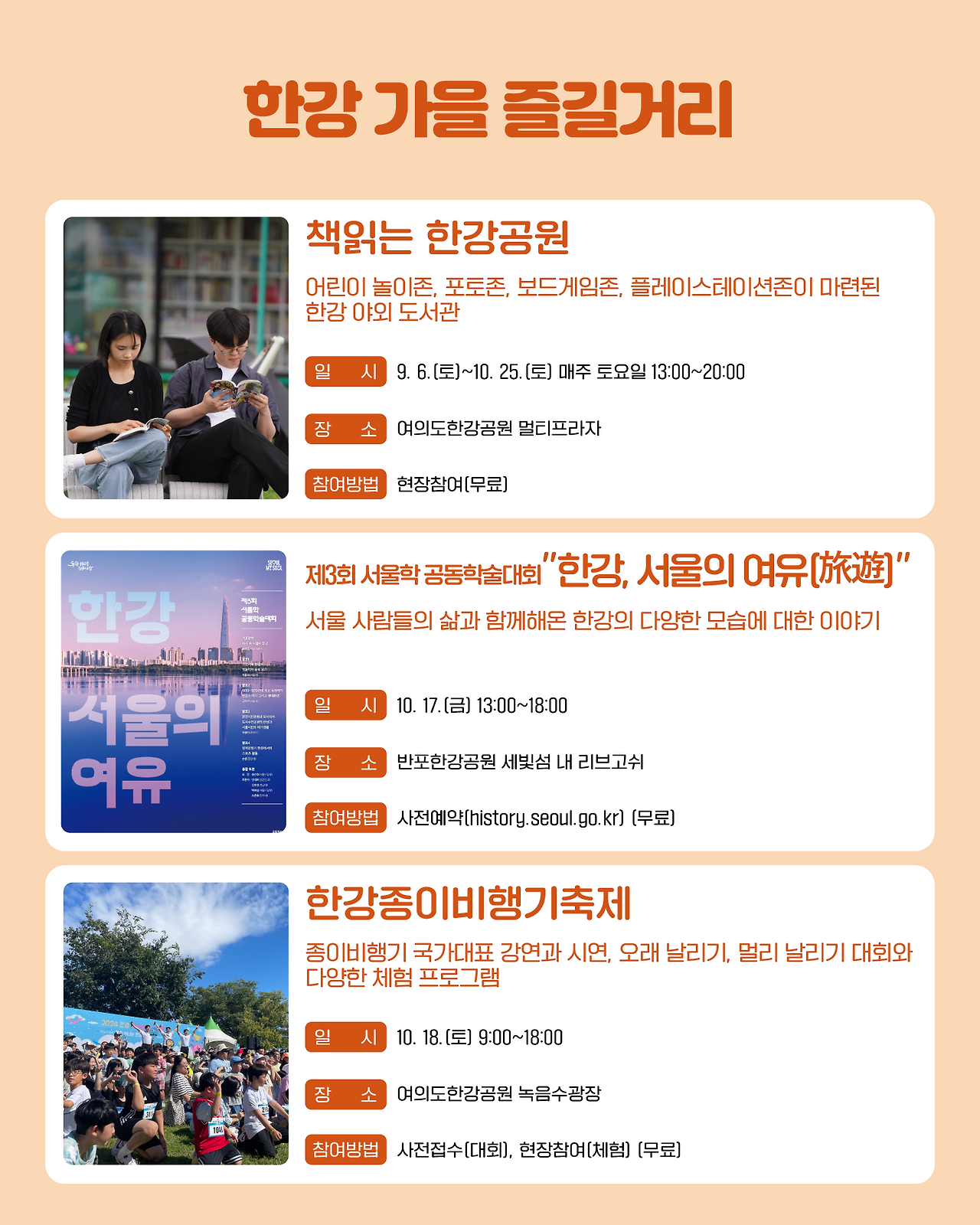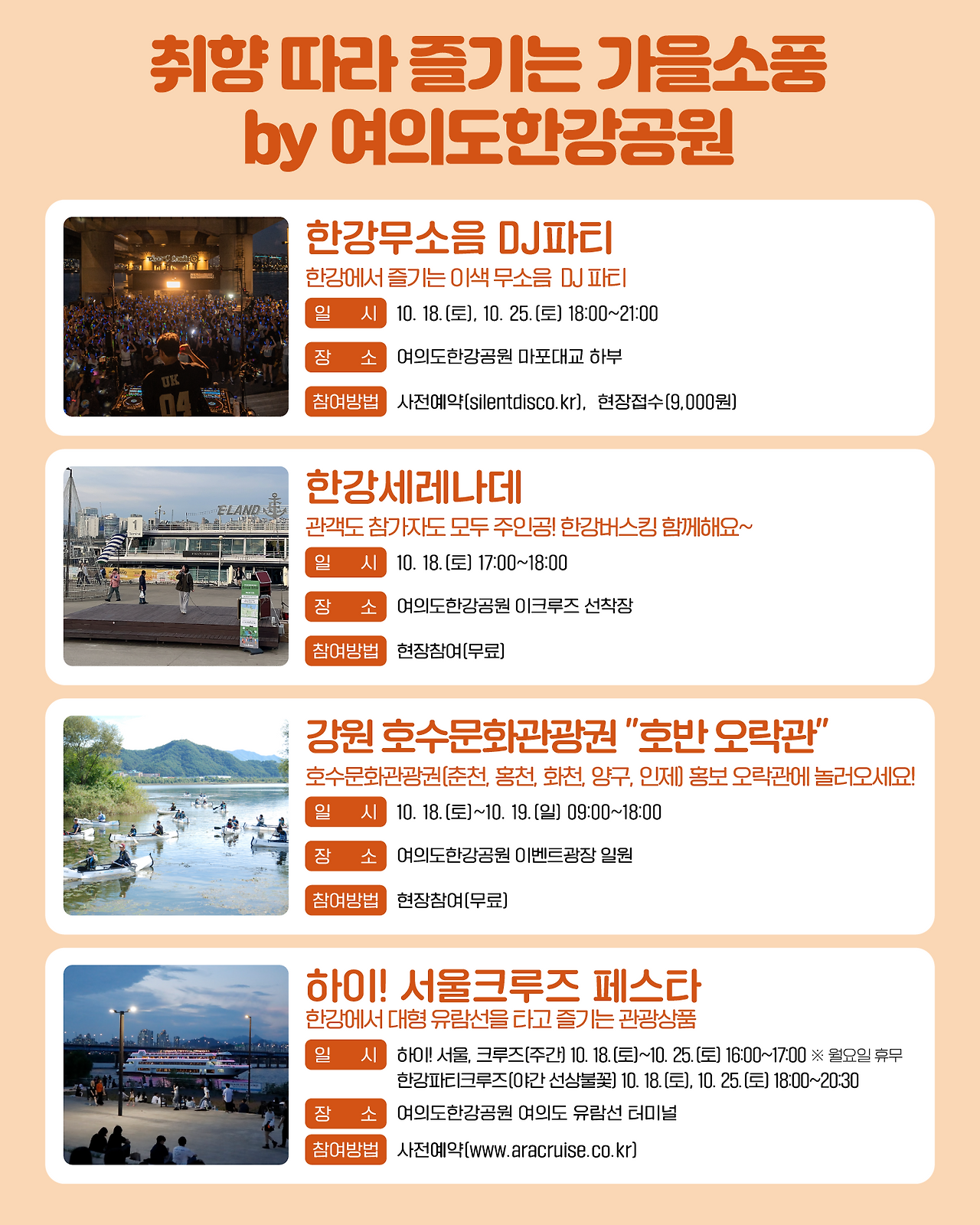 - 장소 주요 지점: 잠실, 반포, 여의도, 난지, 강서 등 한강공원 일대