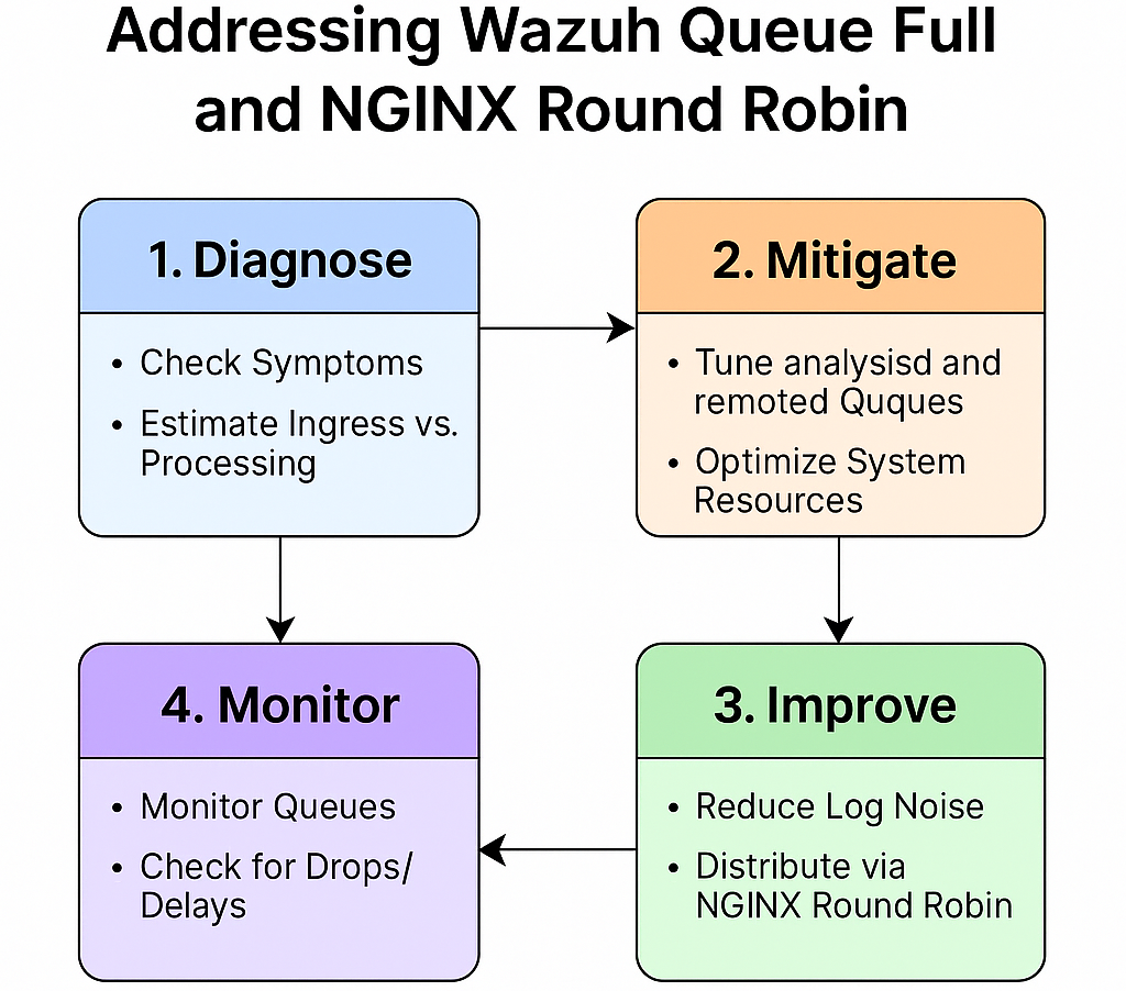Wazuh Manager의 “queue full” 문제를 해소하고, NGINX stream 로드밸런서로 라운드로빈 분산을 적용하는 과정을 점검→완화→근본개선→모니터링 순서로 정리한 가이드입니다. 근거·배경, 보안 관점 점검포인트, 구체 예시(명령/설정)까지 담았습니다.