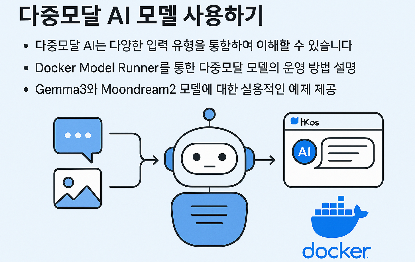 다중모달(multimodal) AI의 개념부터 Docker Model Runner(DMR)로 텍스트·이미지·오디오 입력을 처리하는 실전 방법, 내부 운영/보안 가이드, 점검 포인트까지 한 번에 볼 수 있습니다.