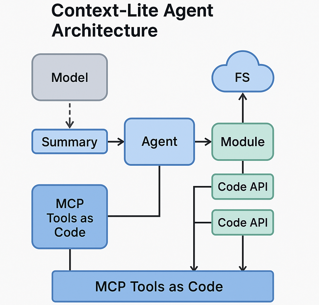 모델은 servers/*의 필요 파일만 read_file로 열람 후 agent_workspace/*.ts에 실행 코드를 생성합니다. 중간 대용량 데이터는 코드 변수/메모리에서만 흐르고, 모델은 결과 요약만 받습니다.