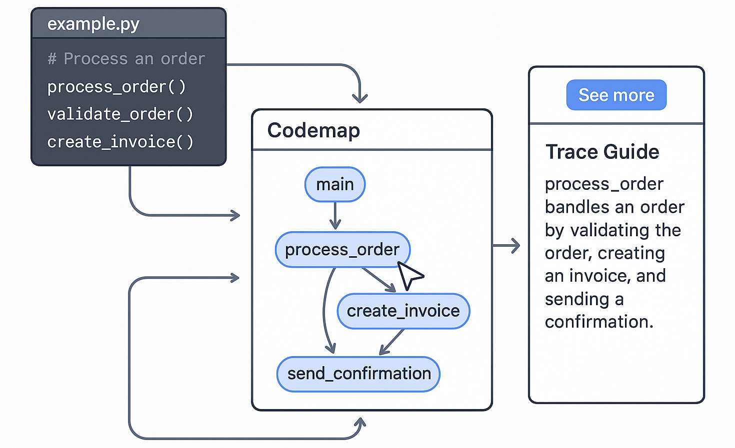 - See more → trace guide: 관련 파일 묶음의 설명/의존성/흐름을 문장형으로 파악