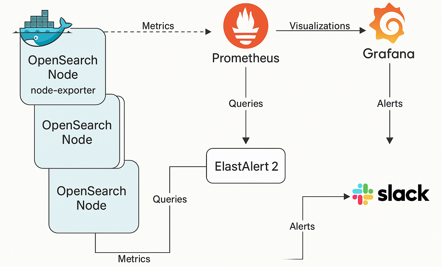 - ElastAlert2로 OpenSearch 쿼리 기반 탐지 → Slack 알림,