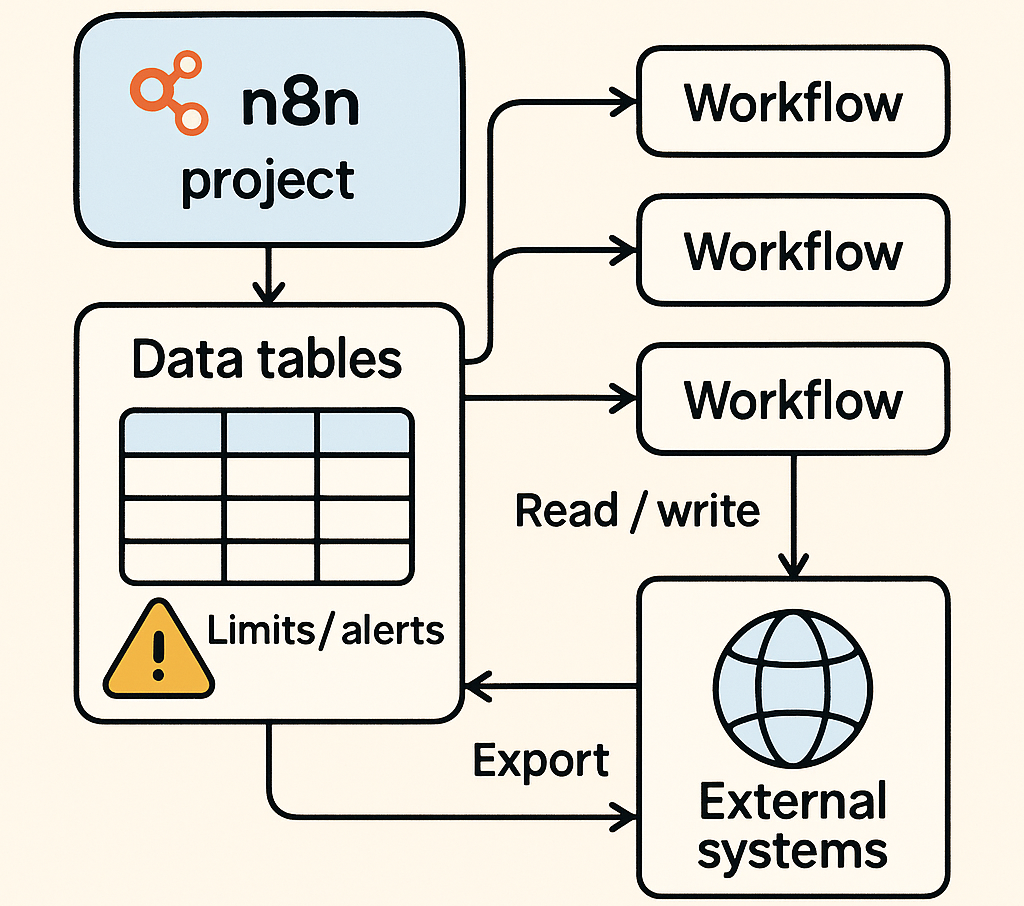 - Data tables는 n8n 안에 내장된 경량 구조화 데이터 저장소
