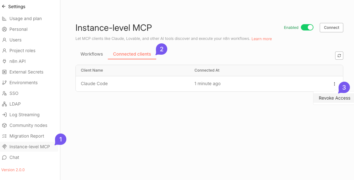 Settings > Instance-level MCP > Connected clients에서 특정 OAuth 클라이언트를 revoke