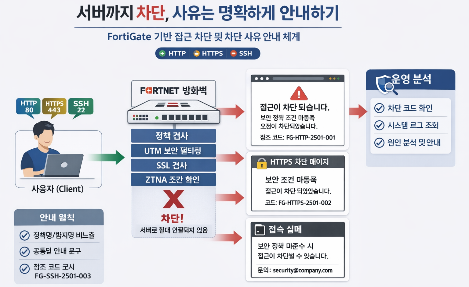FortiGate에서 “서버까지 절대 연결되지 않도록(=FortiGate에서 세션 종단)” 차단하면서, 가능한 범위 내에서 사용자에게 차단 사유를 안내하고, SSH처럼 안내가 원천적으로 어려운 트래픽은 운영/UX로 보완하는 “완전한(종합적·체계적) 방안”입니다.