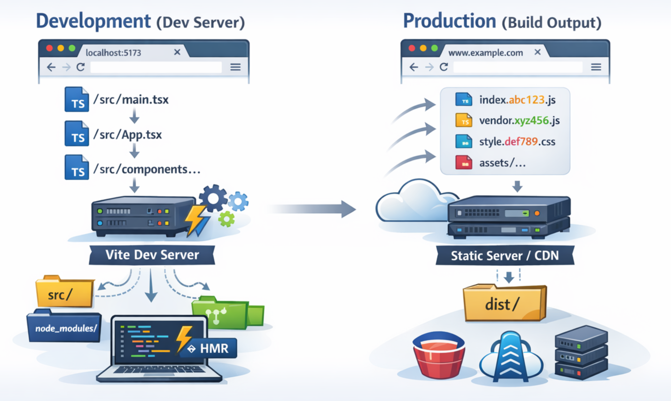 Vite dev 모드 vs prod(운영) 환경을 “동작 원리 → 구성/배포 → 보안 관점 → 점검 체크리스트 → 예시”까지 정리합니다.