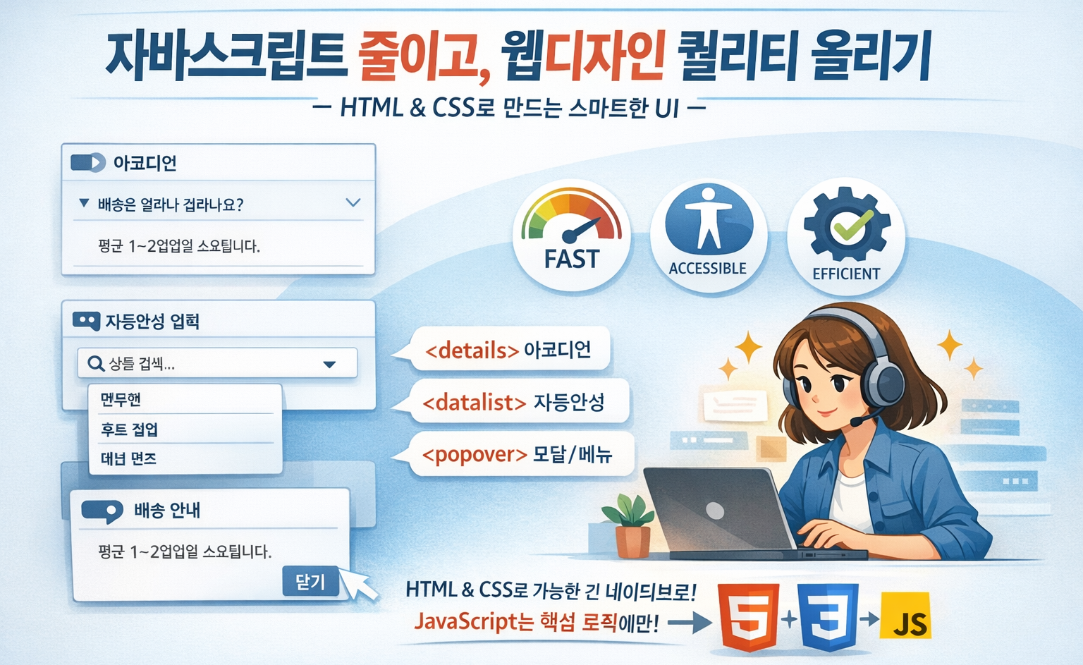 웹디자인(UX·UI·접근성·반응형·퍼포먼스) 관점에서 “실무에 바로 적용 가능한 형태”로 핵심은 “JS를 없애자”가 아니라, 표준 HTML/CSS로 해결 가능한 UI는 네이티브로 처리해 로딩/복잡도/접근성을 개선하고, JS는 정말 필요한 로직에만 쓰자는 방향입니다.