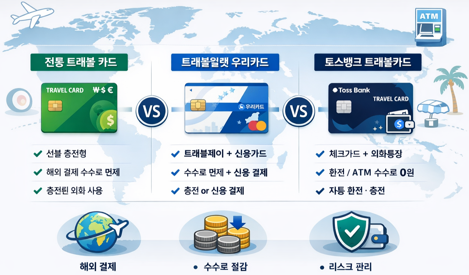 | 구분 | 전통 트래블 카드(선불 충전형) | 트래블월렛 우리카드(결합형) | 토스뱅크 트래블카드(외화통장 연동 체크) |