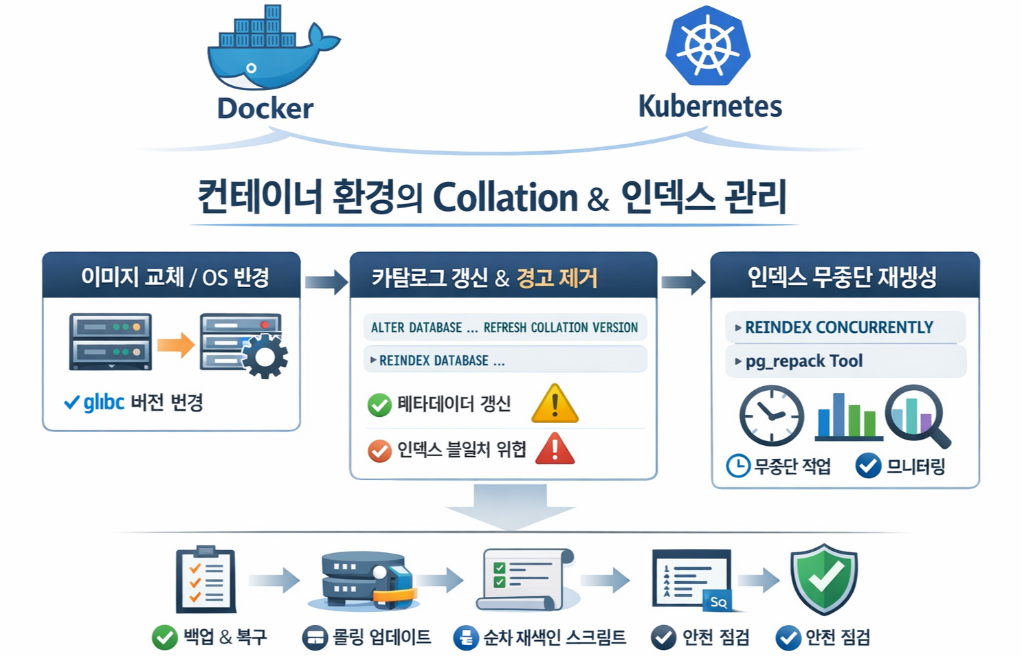 →ALTER DATABASE ... REFRESH COLLATION VERSION→ 영향 인덱스REINDEX또는 CONCURRENTLY. - 컨테이너 베이스 이미지(라이브러리) 변경