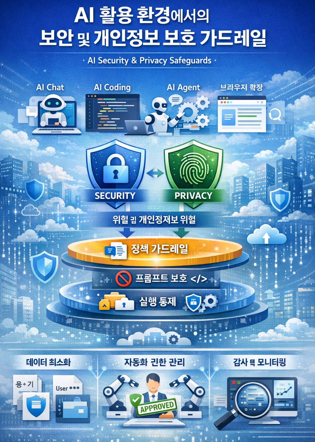 보안(Security) 과 개인정보 보호(Privacy) 관점에서, AI Chat / AI Coding / AI Agent / 브라우저 확장 기반 AI를 “전체 라이프사이클(도입→운영→업데이트→감사)” 기준으로 정리한 가드레일 가이드입니다.