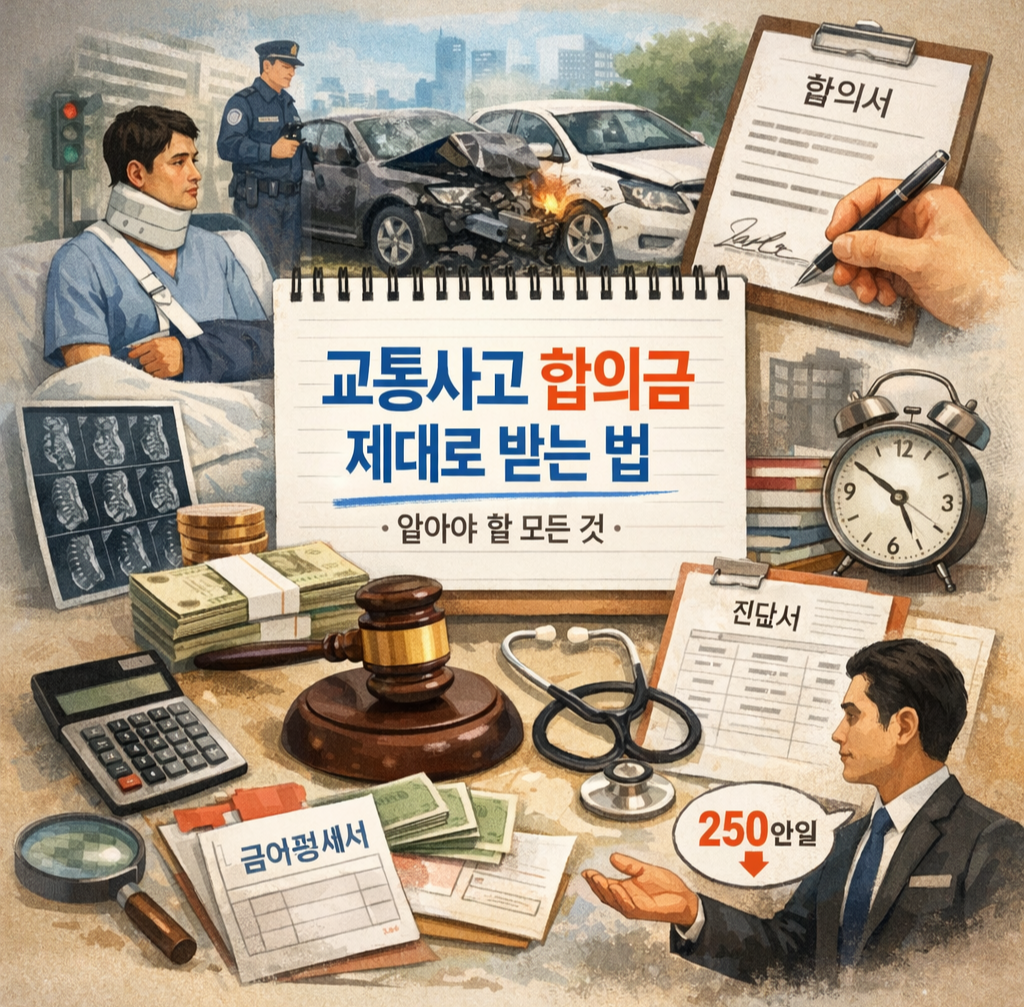 - 빨리 합의할수록: 평균적으로 불리(특히 향후치료비/후유증)