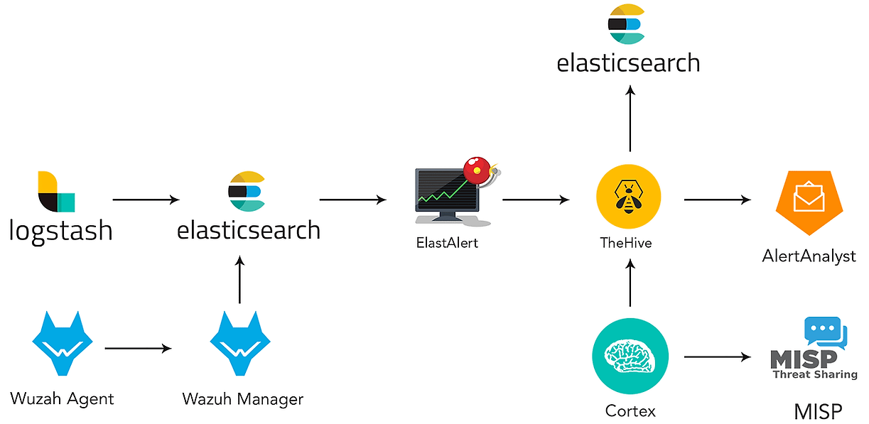 TheHive와 Cortex를 연동하여 SOC(Security Operations Center) 운영을 계획하신다면, 기본적으로 Elasticsearch를 포함한 몇 가지 주요 구성 요소가 필요합니다. TheHive와 Cortex는 특히 사건(response)을 관리하고, 위협을 분석하며, 자동화된 대응을 지원하기 위해 설계된 도구들입니다. Elasticsearch는 이러한 도구들이 데이터를 저장하고 검색하는 데 필수적인 역할을 합니다.