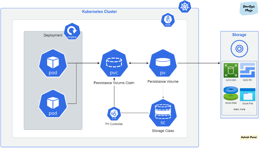 - Persistent Volume Claim (PVC): 개발자가 애플리케이션에서 스토리지를 요청할 때 사용하는 객체입니다. PVC는 필요한 스토리지의 크기와 접근 모드를 지정합니다.