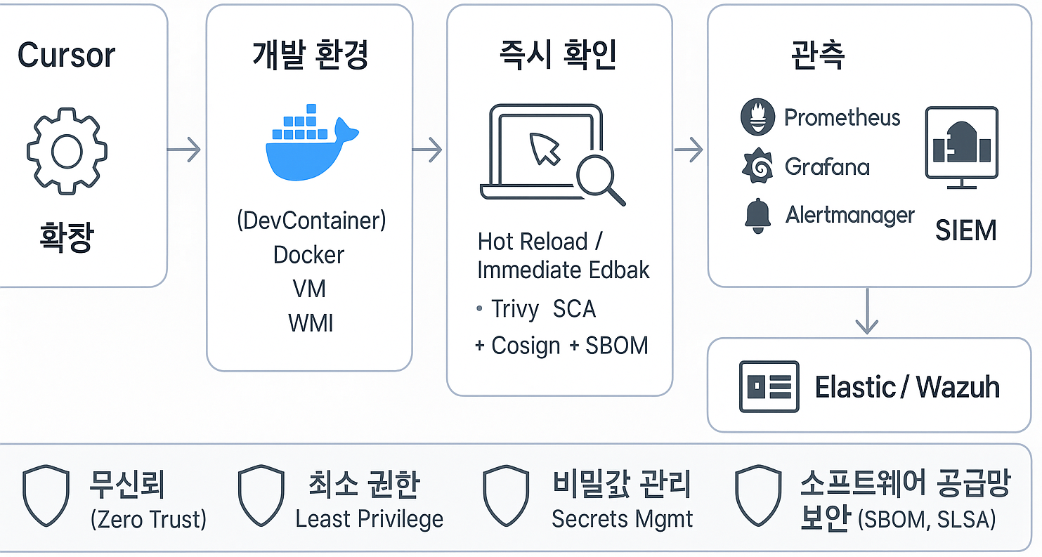 위 구성은 Cursor 확장 추천 → 표준 개발환경(DevContainer/Docker/VM/WMI) → CI/CD·보안 스캔·서명·SBOM → 즉시 확인 → 관측·알림 → SIEM 연동으로 이어지는 현대적 개발·보안 일체화 흐름입니다.